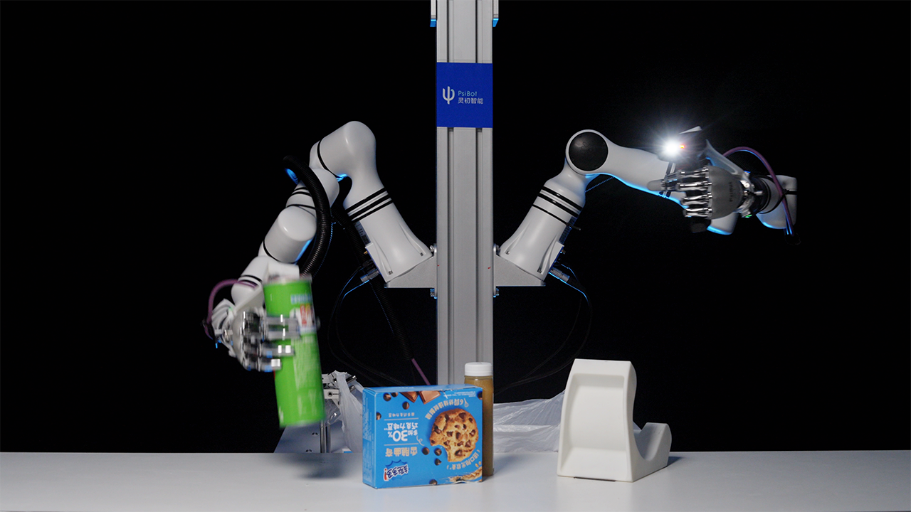 从博弈场景转向实用应用,展会现场的零售打包演示区展现了灵初智能在商业场景中的技术实力。机器人仅接收"将桌面物品打包"的自然语言指令,便可自主分析商品排列、确定操作顺序、完成扫码与装袋动作。整个流程基于VLA模型的分层架构:上层大模型负责理解任务并规划顺序,下层强化学习控制器负责执行动作细节,支持商品级泛化与实时调整,无需逐一标注或人工干预。